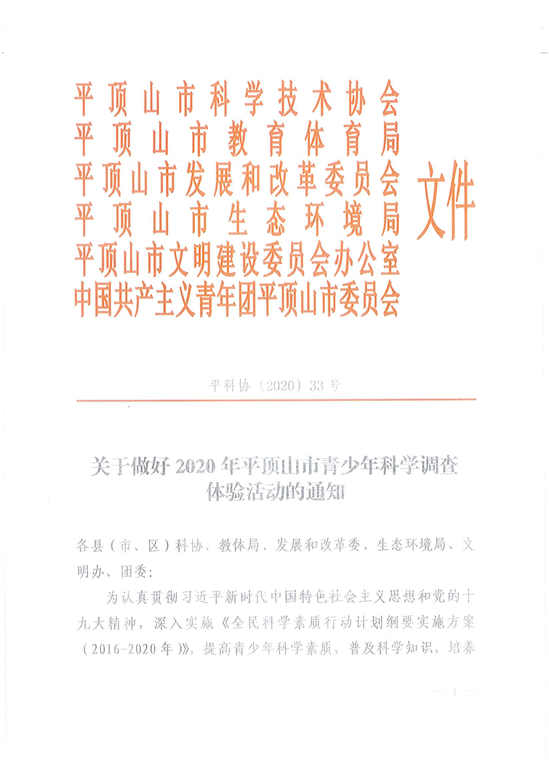 平科协〔2020〕33号 关于做好2020年平顶山市青少年科学调查体验活动的通知