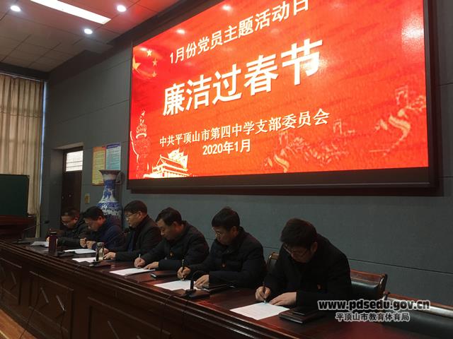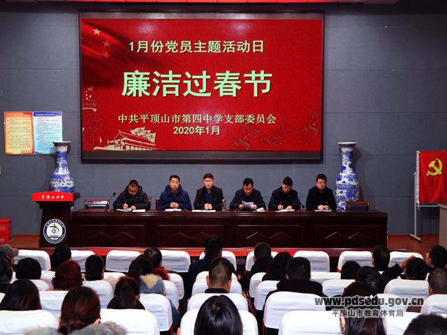 为深入贯彻落实中央八项规定精神和省市委、局党委推进作风建设的要求,进一步加强2020年春节及寒假期间廉洁自律工作,1月19日上午,平顶山市四中在校讲座厅召开春节廉政提醒会暨一月主题党日活动。会议由党支部书记高海全主持,全体党员及中层干部出席会议。