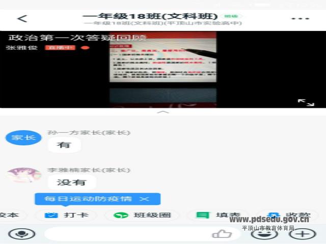 各年级组制定统一课表,学科备课组长带领教师网上集体教研,运用集体智慧进行备课、选题,精心从北京四中网校、学习强国、其他网校资源或者集体原创中选取优秀资源,并利用北京四中网校平台、微信群等向学生推送课件和习题,在学生吸收反思之后,通过微信群反馈学情,教师再通过QQ、“学习强国”、“西瓜”、钉钉、CCtalk等直播平台为学生直播答疑。从实际操作情况看,实验高中教师线上教学热情高涨,大家纷纷摩拳擦掌,探索更有效更科学的形式,尤其是实验高中高一年级,在上个学期开展了依托北京四中网校的平板智慧化教学,如今老师们操作起来更是得心应手。班主任负责学生落实情况,利用平台统计、每日三次拍照上传打卡、家长签字等方式监督,发现并指出问题,拟定每日一语,激励学生坚持学习。
