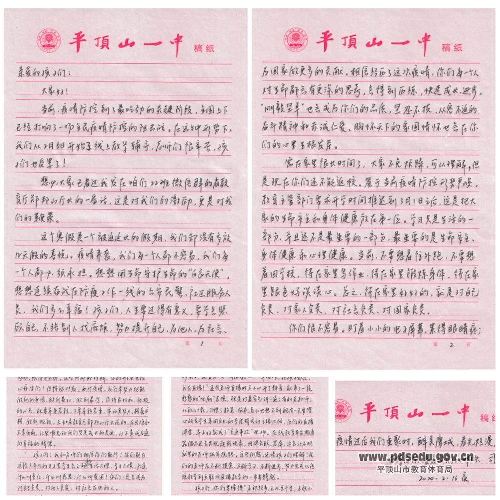 “疫情来袭,我们每一个人都不容易,我们每一个人都必须承担。想想用生命守护生命的“白衣天使”,想想连续奋战在防疫工作一线的公安民警、社区服务人员,我们多么幸福!孩子们,人生要过得有意义,要学会照顾自己,不给别人找麻烦,努力提升自己,为他人、为社会、为国家做更多的贡献”“待在家里好好的,就是对自己负责、对家人负责、对社会负责、对国家负责。”这是平顶山市一中高一22班班主任司东晓给学生的亲笔信中的一段话,这是平顶山市一中广大教师的缩影。学校在搞好在线课堂教学的同时,时刻不忘对学生进行德育教育和心理健康辅导。