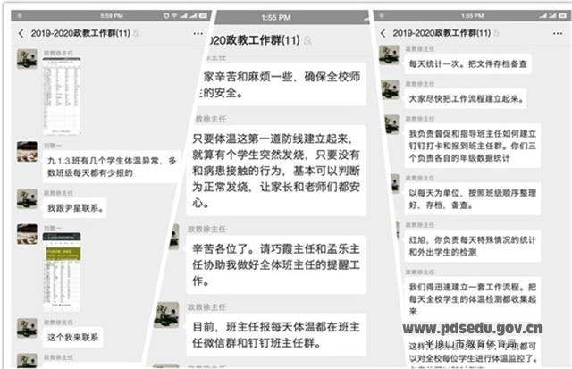 政教处主任徐仲接到任务后,立即召开政教处微信群会议,进行了明确分工:班主任负责收集数据、刘敬一整理数据、赵强反馈数据,李真真跟踪数据,安红旭上报数据.....大家都清晰明了各自的任务和责任,担起学校战“疫”的第一道防线重任。