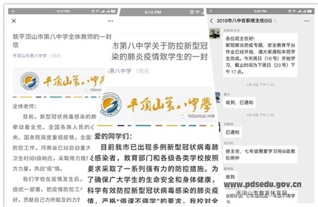在接到上级任务通知后,当晚政教处就编写出了新冠肺炎疫情《致全体家长学生的一封信》,并及时通知班主任,通过公众号、微信群对家长学生进行告知。16日,《安全教育平台》发布新冠肺炎防疫的专题学习,政教处每天在群中公布各班的完成情况,督促大家及时完成学习,让家长充分了解疫情知识,争取做到杜绝学生和家长感染新型冠状病毒。