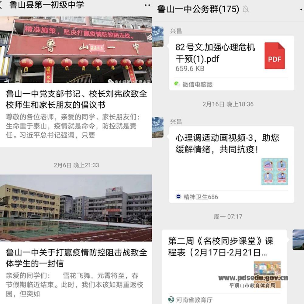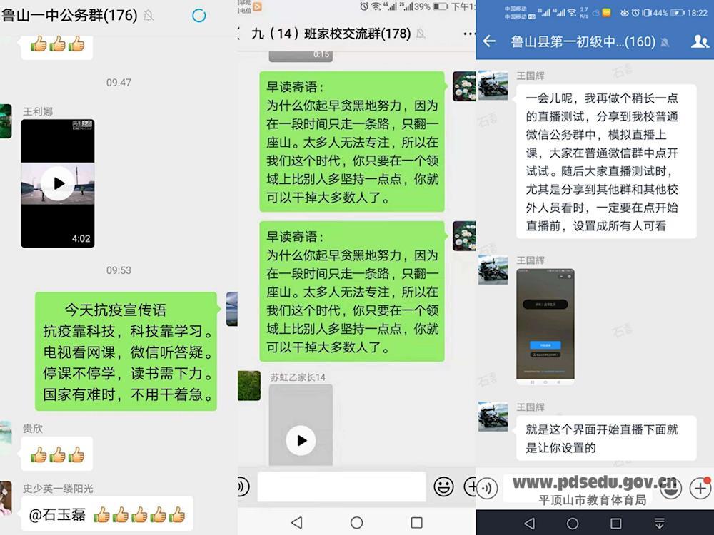 抗疫靠科技,科技靠教育。为了贯彻落实河南省教育厅《关于做好疫情防控期间网上教学工作的指导意见》和市、县教体局、琴台中心校相关文件精神,最大限度减少疫情对学校教育教学工作的影响,鲁山一中根据实际情况,因校施策,精心组织网上教学活动,真正实现“离校不离教,停课不停学”,确保教育教学质量不下降。