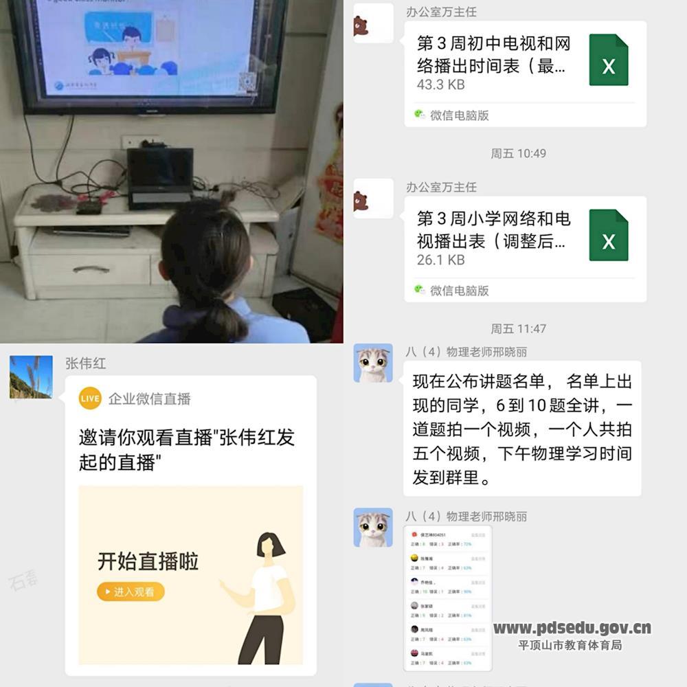 组织学生收看微课,自力更生争开直播。在家就能上名校,网上就能拜名师。名校同步课堂是省教育厅邀请省实验中学、省实验小学等省级名校优秀教师精心录制的微课。学校发布收看方法指南,各班班主任和任课老师认真组织学生及时收看,认真做笔记。网上名师虽好,但也有无法提问互动,个别科目版本不照的瑕疵,老师们不得不自力更生想办法。有的老师把讲课、答疑内容录成小视频发到微信群,有的老师用企业微信软件开直播,有的老师指导学生当小老师轮流讲课,可谓是八仙过海,各显神通。