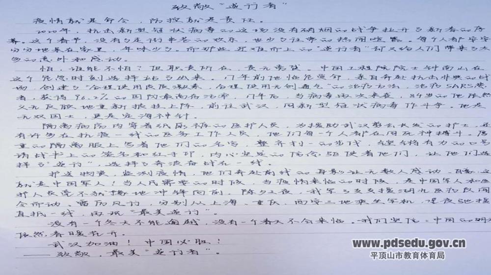 “晩昏三更入梦时,寒气刺骨紧裹被。一夜骤雪降屋前,拂帘天地皆变色。不同往日嬉戏雪,同气连枝共克艰。借问瘟神欲何往,纸船明烛照天烧。”市实验中学九五班郑嘉祥同学用自己稚嫩的笔抒发出“山河有恙,温情在”的情怀。