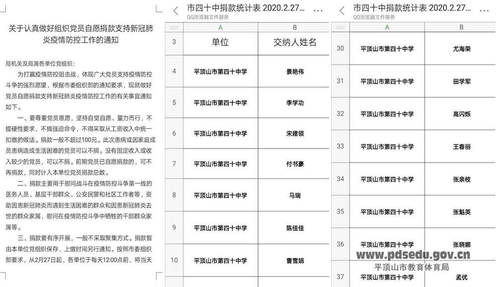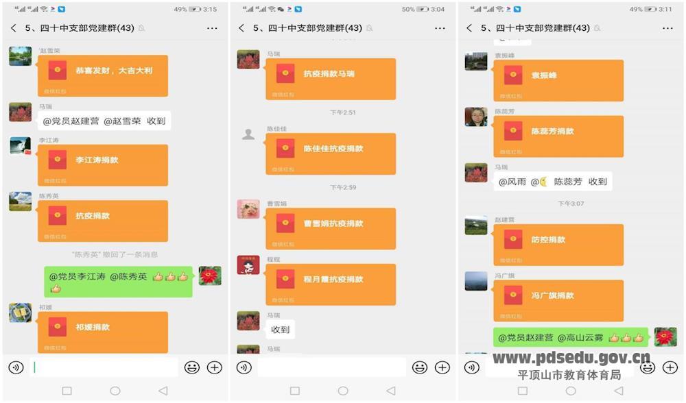 2月27日,市四十中微信群里一份“温暖”的通知迅速传开。没有轰轰烈烈的场面,没有激动人心的乐曲,一场自发的党员捐款活动,通过网络平台默默展开,无声的爱如一股暖流在网上汇集。市四十中党支部书记景艳伟率先行动进行捐款,她说:“作为教师不能像医护人员一样冲在疫情最前线,只能通过这种方式尽自己的绵薄之力,这也是我们党员应该做的。”随后,党员们纷纷行动,自愿捐款支持新冠肺炎疫情防控的活动,以爱之名,共克时艰。