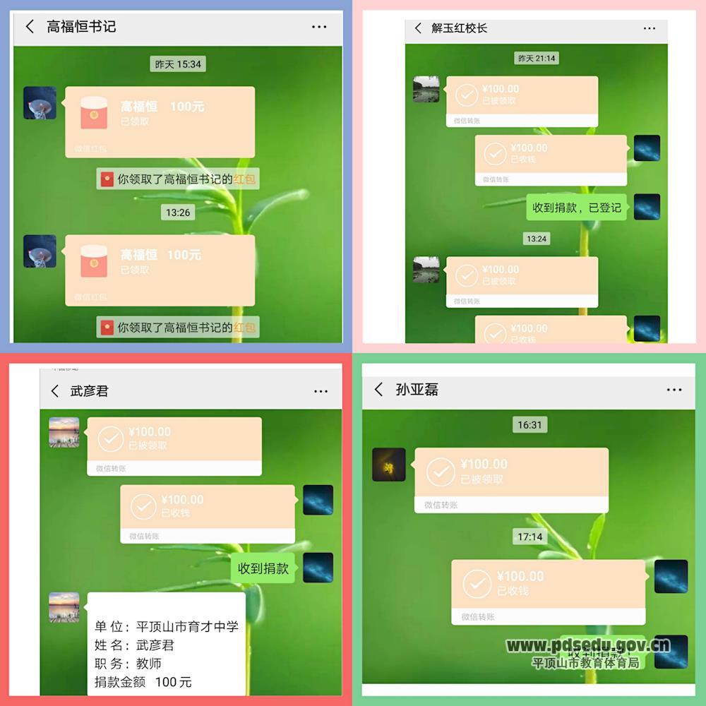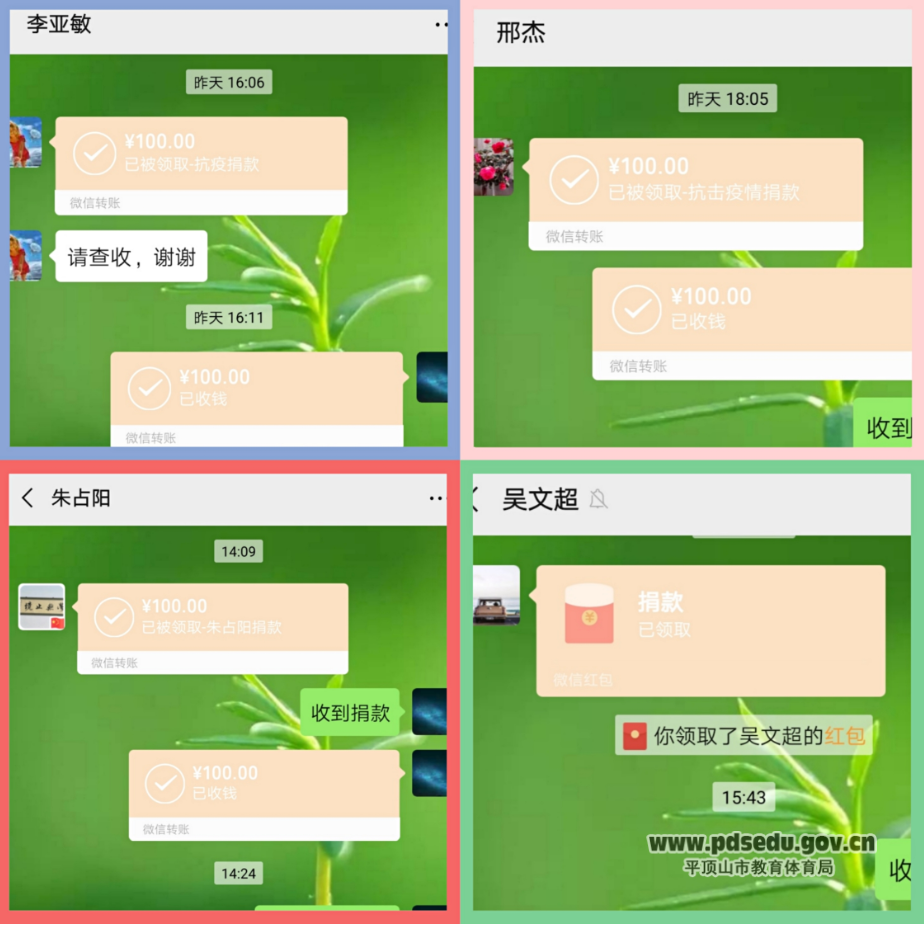倡议发出后,学校领导班子成员首先响应,书记、校长乔延峰带领领导班子率先垂范,并立刻得到了全体党员同志们的热烈响应,大家纷纷慷慨解囊,通过微信、支付宝、电子银行转账等方式进行捐款。“国家有难,义不容辞,算我一份”,全体党员同志们用自己的爱心为抗击疫情添砖加瓦。献出自己的一片爱心。
