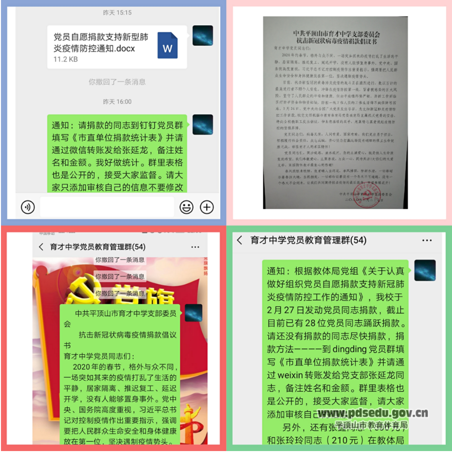 2月27日,为响应党中央号召,按照市教育体育局党组的部署,市育才中学校党支部在书记乔延峰的倡议下积极行动,通过微信群、钉钉群、短信向体党员同志们发出“抗击新型冠状病毒肺炎疫情捐款倡议书”,号召大家伸出温暖的双手,为抗击迎情一线加油,用真情与真爱筑起疫情防控的坚强屏障。