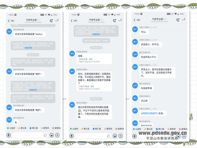 初次接触线上教学工具,因其功能繁多倍感眼花缭乱,幸而大家有不服输的韧劲,摸索出了属于自己的方法,借助教育信息平台的资源,查找图片、课件、音视频资料,有效拓展了教师备课的知识空间并提升了教学效果。钉钉的植入,又将平台的功能放大,使师生之间、生生之间以及家长与老师之间有了进一步交流的舞台。刚开始,直播有噪音,网络不顺畅,状况不断。但办法总比问题多,大家纷纷尝试换麦克风、耳机,调整电脑位置,互相咨询解疑,经反复试播,都找到了解决方案。经过两周的多次直播,老师们的能力不断提升,从“一言堂”到积极活跃的师生、生生互动,有效地了解学情并掌控了线上课堂,为后续教学提供了有力的依据。