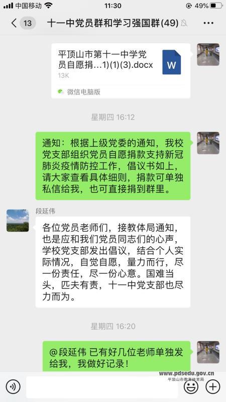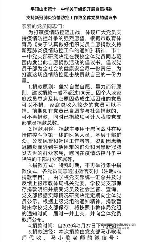 为打赢疫情防控阻击战,市十一中充分发扬“一方有难、八方支援”的优良传统,2月27日下午,市十一中党支部研究决定在全体党员范围内发出此自愿捐款活动的倡议书,倡议党员干部为全社会的健康安全尽一份责任,为打赢这场疫情防控阻击战贡献自己的一份力量。
