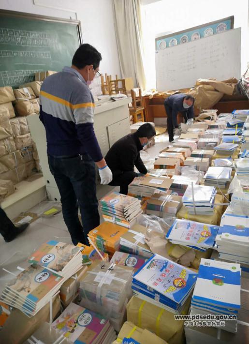 为做好发放教材的准备工作,2月28日下午,教务处7位老师在副校长郭军、教务主任陈晓辉的带领下,把教材按照年级摆放到位。大家用了半天的时间把教材按年级、班级进行分检,再按班级人数进行配置,最后对分好的教材进行喷雾消毒。