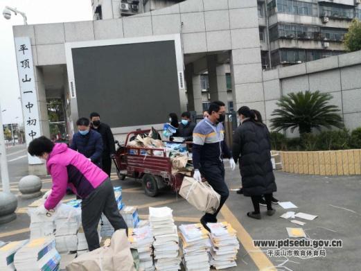 发书当日,乔延峰又亲自带领全体中层参与到现场教材的运送工作中来。学校在大门口东西两侧分年级、班级错峰、错时发放教材:3月1日下午七年级,3月2日上午八年级。每两个班级分配一个小时的时间,七年级1-6班、八年级1-5班在大门东侧,七年级7-12班、八年级6-10班在大门西侧。