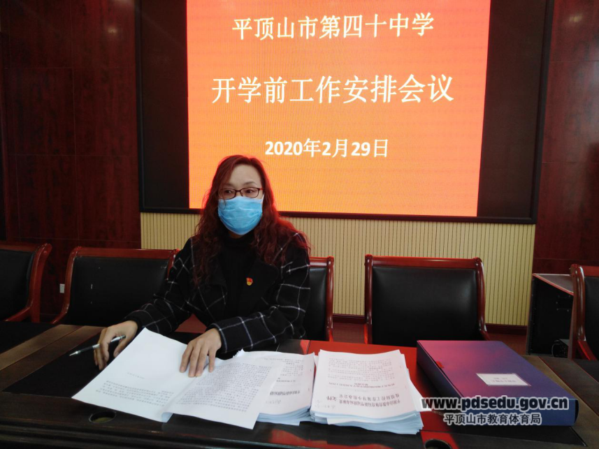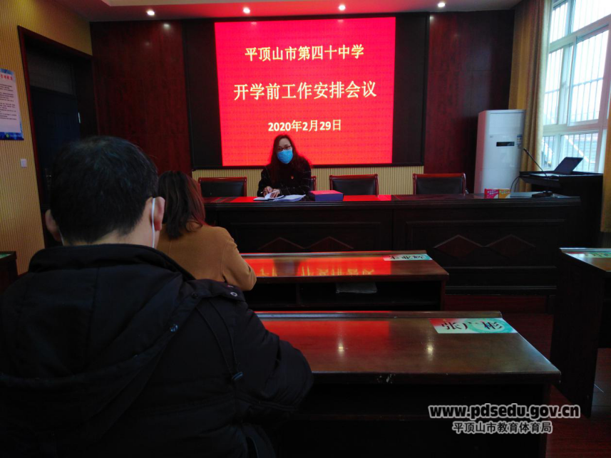 2020年2月29日上午,平顶山市四十中在学校报告厅召开开学前工作安排会议,学校党支部书记、校长景艳伟主持会议,学校领导班子成员和中层干部参加会议。