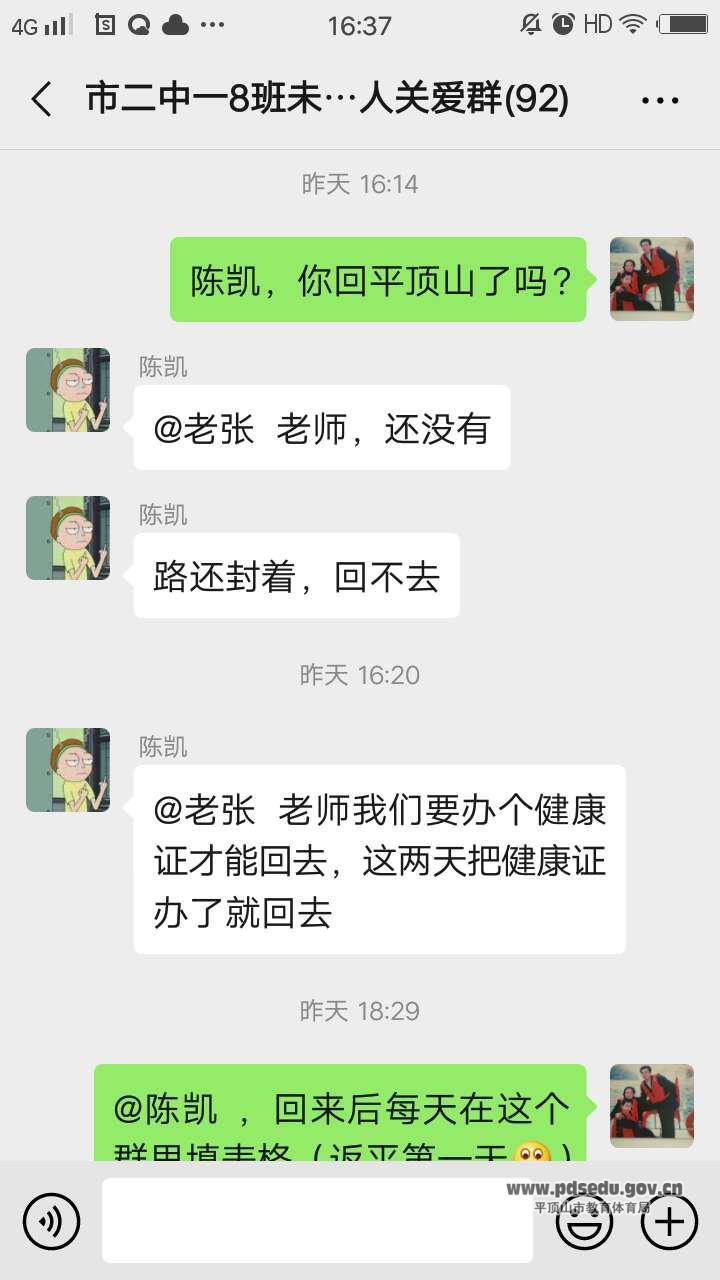 一(8)班班主任张君荣老师除了对在平学生进行家访之外,还特别关注尚未返平学生的情况,在微信群里仔细询问学生状况,告知学生返平时应当注意的防控措施。