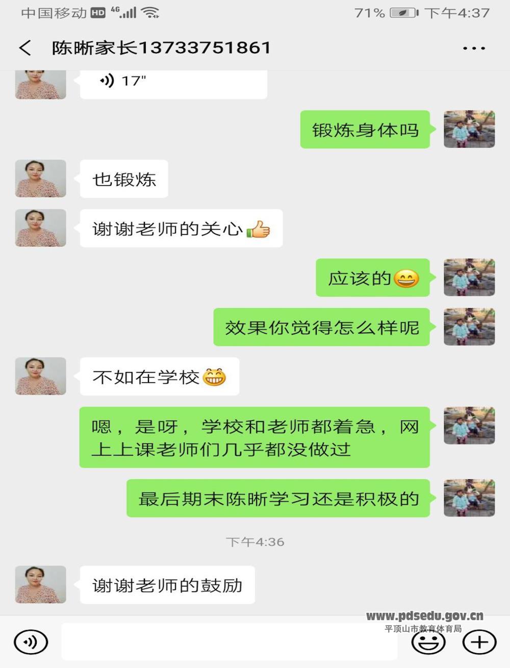一(16)班班主任陈威锋老师跟学生家长建立私信,详细了解学生居家一日情况,对学生的身体健康表达了关心之情,深受家长感激。