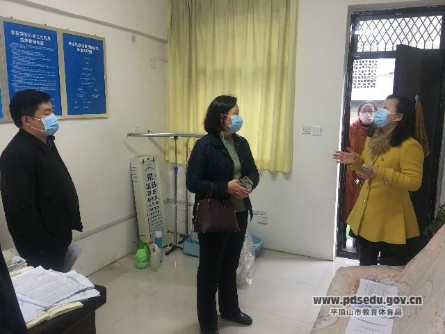 3月3日下午,市教体局副局长苏红英、办公室主任薛耀炜到市十一中检查督导新冠肺炎疫情防控工作,校长梁伟丽带领十一中疫情防控成员迎接检查。