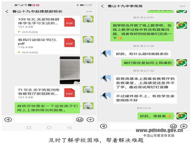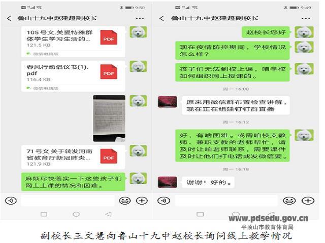 同时学校兼职支教帮扶教师王文辉、梅林等也通过电话、微信等方式和鲁山十九中的老师取得联系,将自己线上教学的情况、采取的措施、对学生进行心理疏导、做好线上家访等方面的心得,分享给帮扶教师。并及时了解所帮扶的建卡贫困学生存在的学习困难,有针对性地安排帮扶措施。