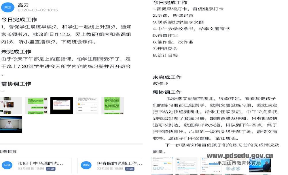 为了不让疫情影响学习,老师们线上上课,布置作业,批改作业。晚上11点多,还能在钉钉群里看到老师刚刚提交的优秀作业。白天学生上网课,晚上老师们直播进行线上答疑。有的学生未能按时上交作业,老师们就打电话或微信与学生沟通,与家长沟通,此举不仅使学生的作业提交率大幅提高,而且也得到了家长们的一致好评。