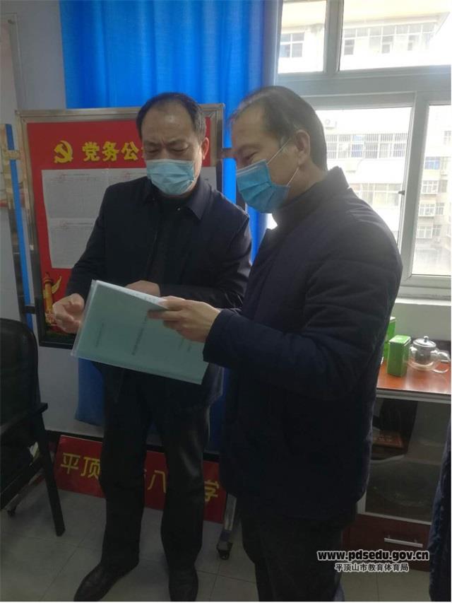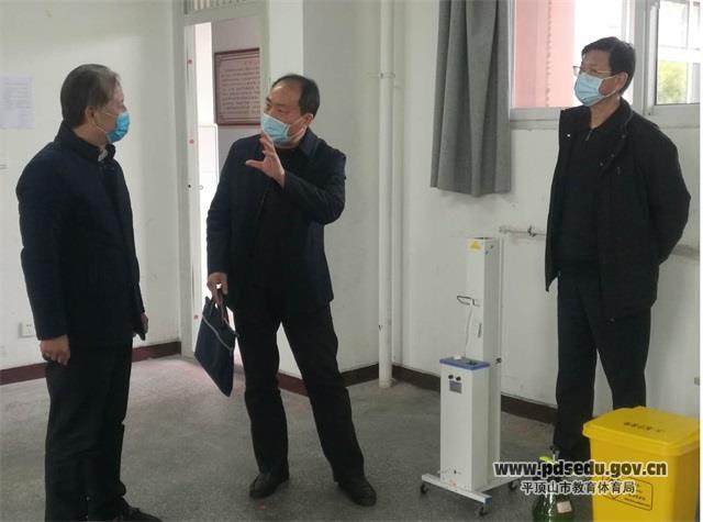 3月3日下午,平顶山市教育体育局党组成员、副调研员李俊峰、教体局体卫艺科科长袁朝军、教体局疫情防控工作办公室顾亚凯一行三人到八中检查指导疫情防控工作。