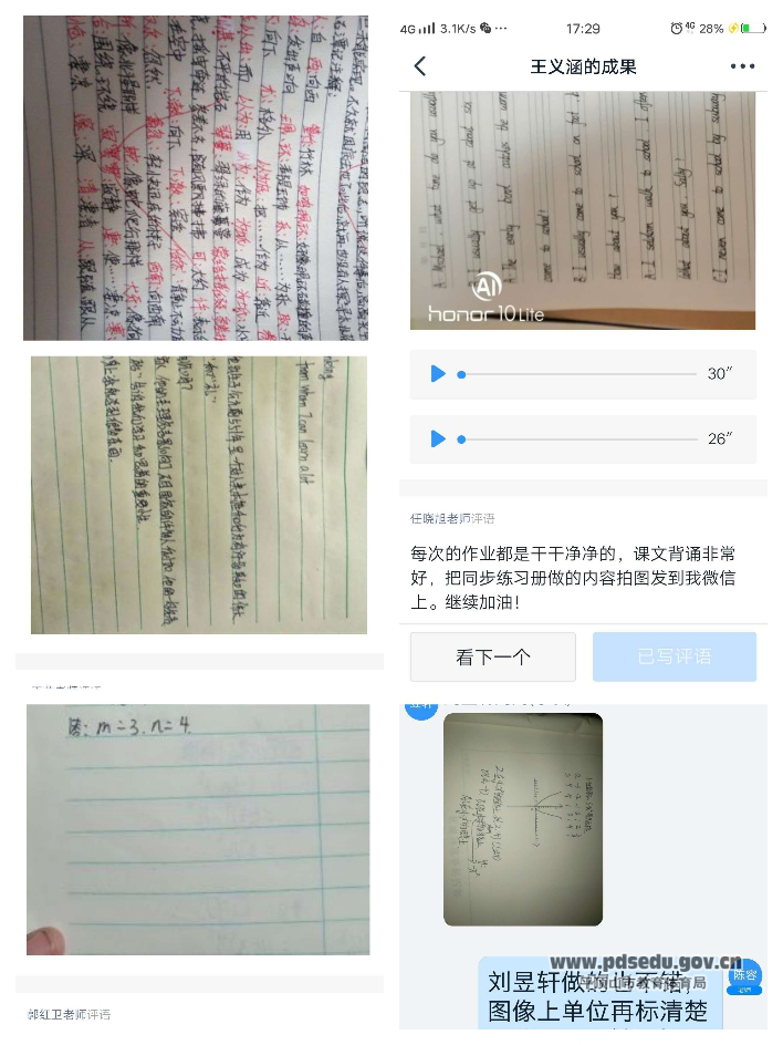 线上授课结束后,老师们又开始批改学生提交的作业,从作业反馈中及时了解学生的掌握情况。一道道批语、一句句鼓励、一篇篇评点的背后,是老师们对教育的热爱,对学生的负责和“战疫”时期作为教育工作者的一片赤诚。