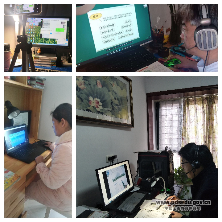 到钉钉直播答疑、互动时间了,老师们更是“八仙过海”,各有妙招。雷恒旭老师把摄像头粘在家里的台灯上、安建利老师的“怀旧耳机”再次出山、贺新老师用手机支架对着电脑直播、吕媛媛老师已近预产期仍透过屏幕为学生送去清晰的讲解……百变的花样,不变的坚守,四十二中人一直在做学生的领路人。