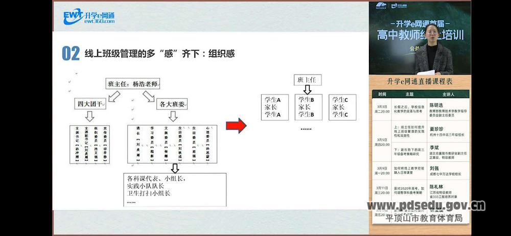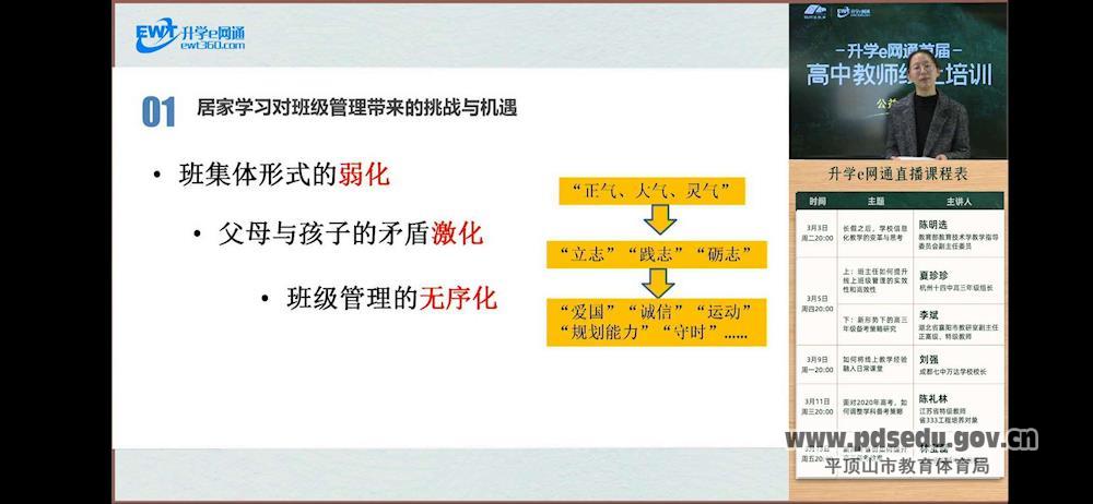 3月5日晚上20:00,平顶山市第二中学迎来了一批“活雷锋”——升学e网通高中教师线上培训公益直播课程。在当前新冠肺炎施虐,开学时间再三延迟的情况下,如何最大限度地减少疫情带来的不良影响,确保高三教学质量,提高线上课堂教学和班级管理的实效性,学校业务副校长刘江辉给老师们带来了一个好消息:升学e网通首届高中教师线上培训公益直播第2期于当晚20:00进行,教师只需实名注册一下,就可免费进入直播听课。