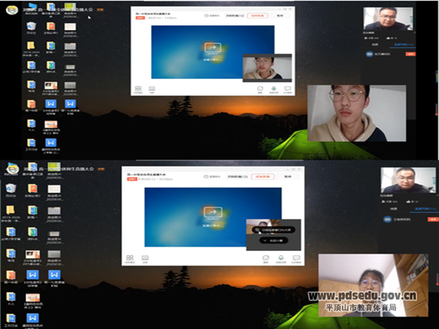 会议分两个阶段进行。上午,首先召开了由高一班主任和各学科备课组长参加的视频会议。会上高一年级各班班主任分别发言,反映在线上教学管理学生过程中出现的一些问题以及解决的办法。详细介绍了如何成立班级疫情防控小组、学习小组,如何以电话、视频会议、直播等形式沟通家长与学生等经验。高一(11)班班主任武彦杰把本班钉钉群里的家校本作业精确到每分每秒,与本班任课老师及时沟通,及时询问未看直播学生情况,并以表格形式统计学习情况,将线上教学和管理做得细致入微,学生没有提交疫情防控统计表的,他立刻家访,询问学生的身体状况。他的分享让与会人员纷纷点赞。