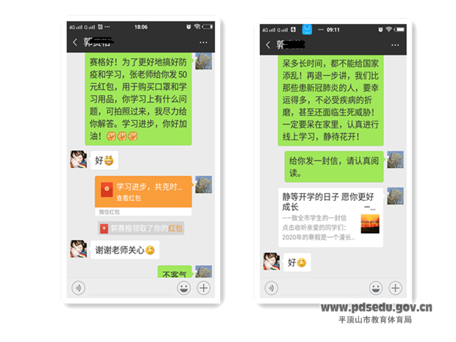 在学校的组织和倡议下,广大教师积极响应,鼎力配合,通过电话、视频连线,在钉钉或微信等app上以网络直播等形式,同时包含答题、聊天、操作课件等在线互动方式,随时关注他们的生活和学习状况,为他们制定学习规划,认真帮扶,涌现了很多令人称颂的人和事:教务科副科长、高讲讲师张刚伟不但给帮扶学生答疑解惑,还利用专业优势,安慰学生对党和国家有信心,不用对疫情过分紧张,还专门给学生捐款,鼓励学生安心学习,学好知识,为国出力;心理老师靳彩利在课余时间,与学生和居家陪护的家长保持沟通,还为帮扶学生进行心理测评,开展心理辅导,驱散学生心中的阴霾,引导学生以实际行动支持父母工作……各科老师见仁见智,百花齐放,有的嘱咐同学们要珍惜时光,心怀感恩,把暂时的困难当作一种精神财富;有的老师鼓励学生勤奋学习,自强不息,在校做一名好学生,在家做一名好孩子,在社会上做文明的小公民;有的老师激励学生要用实际行动来迎接这个充满挑战的时代,将来为家乡的建设、为社会的进步做出应有的贡献。广大教师的努力和行动赢得了帮扶学生及家长的高度评价。