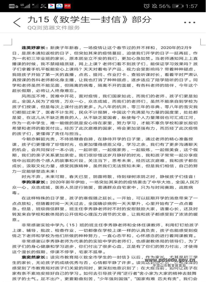 2020年3月1日,接到市新冠肺炎疫情防控教育体育系统工作专班办公室《致家长一封信——静等开学的日子 愿你更好成长》,校领导马新峰校长第一时间安排政教处将学习内容布置到全校15个班级,各班班主任利用短信,微信群,钉钉群等平台工具发送给每一位学生家长供学生和家长一起学习。