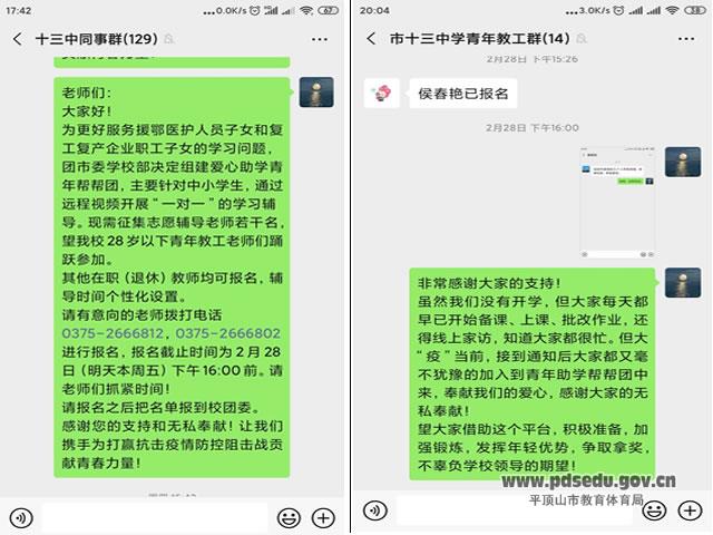 为更好服务援鄂医护人员子女和复工复产企业职工子女的学习问题,近日,市十三中团委积极响应团市委学校部的号召,组织青年团员教师加入爱心助学青年帮帮团,将通过远程视频开展“一对一”的学习辅导。