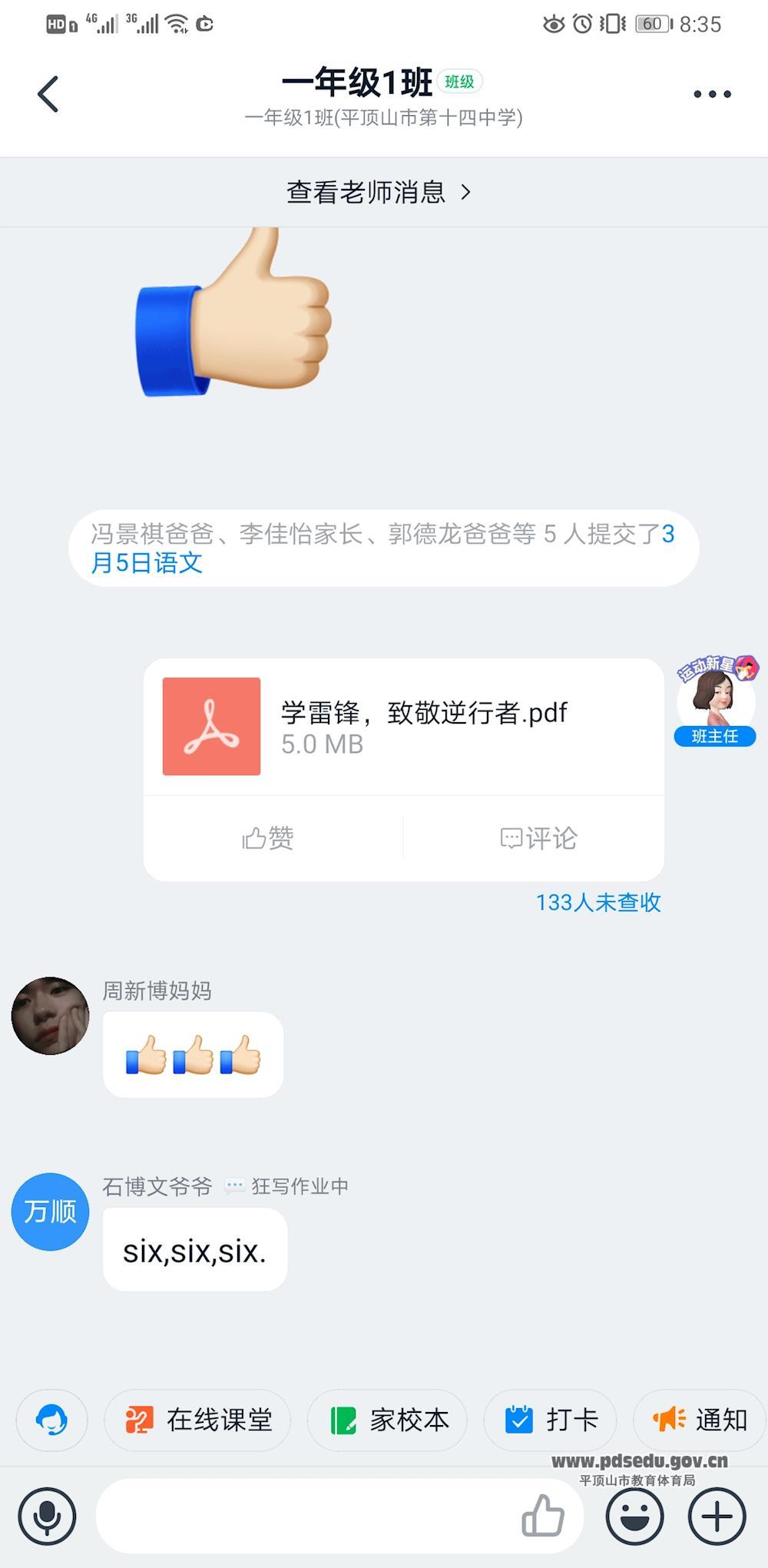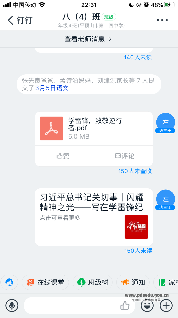在十四中团委的组织下,各班利用钉钉班级群,分享了“学雷锋·致敬逆行者”班会学习资料,共同阅读了新华社评论文章《闪耀精神之光——写在学雷锋纪念日之际》一文。九年级的团员学生,还通过微信平台上进行了“筑起防疫青春长城”主题团课学习。