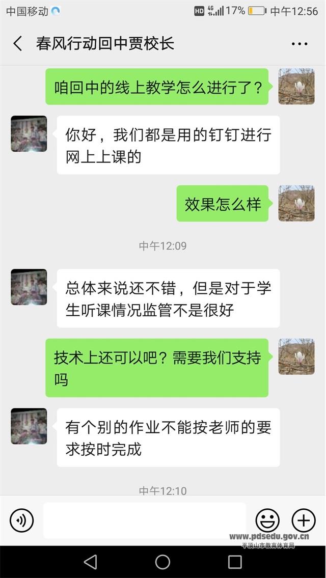 副校长荆小辉亲自抓“春风行动”工作,她多次打电话询问叶县回民中学的疫情防控工作、教师线上授课、学生在线学习情况等,并用微信就八中开展“春风行动”活动方案和叶县回民中学校长进行沟通。