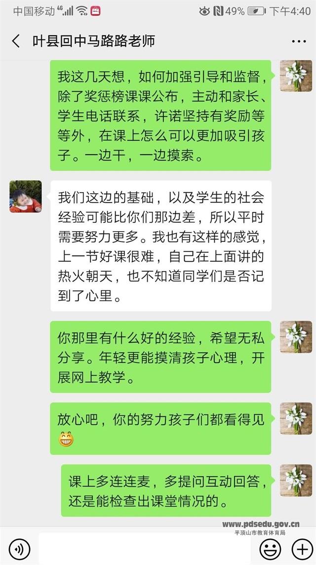 新冠肺炎疫情防控期间,在做好各项防控工作同时,市八中响应市教体局文件精神,积极开展线上“春风行动”,和对口支援学校叶县回民中学联系交流,多措并举,两校齐心共力战疫情,共同谋发展。