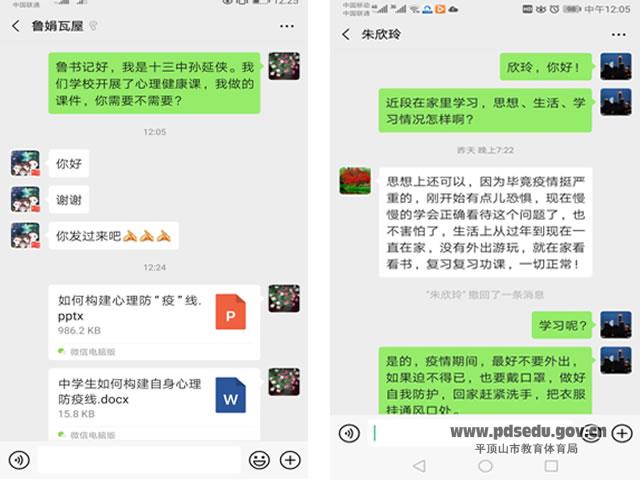 孙延侠和孙玲老师与瓦屋中学的鲁娟老师进行联系,分享健康教育宣传和心理疏导教育课件,开通网上心理健康教育课程,有针对性地做好特殊学生的心理疏导.