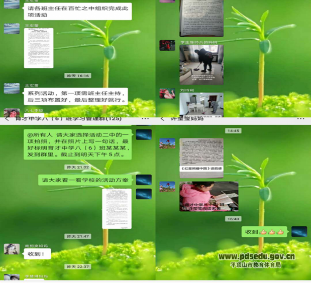 育才中学政教处通过钉钉和微信平台,提前布置,认真安排。各班班主任老师,根据本班的实际情况,根据活动主题,制定活动方案,召开线上主题班会。学生和家长在线上积极参与。线上活动结束后。在学校的倡议下,同学们在家中纷纷化身“小雷锋”,或帮家长做家务,拖地、擦桌子、做饭、洗衣用自己力所能及的方式体验帮助他人的乐趣。
