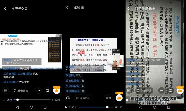 七年级老师们讨论直播上课过程中存在的问题:互联网技术的运用及网络卡顿问题;如何调动学生积极性,与学生及时互动问题;课下作业布置及检查反馈等,交流经验,商讨解决方法。他们还相互通报教学进度,安排下周教学内容。大家一致认为:讲课不宜进行得太快。课堂上要积极与学生短信互动,这样既能及时了解学生对知识的掌握情况,又能提醒学生认真听讲并思考问题,保证听课质量。课下根据讲课内容布置适量的作业,规定时间拍照上传,教师要及时批改并反馈。