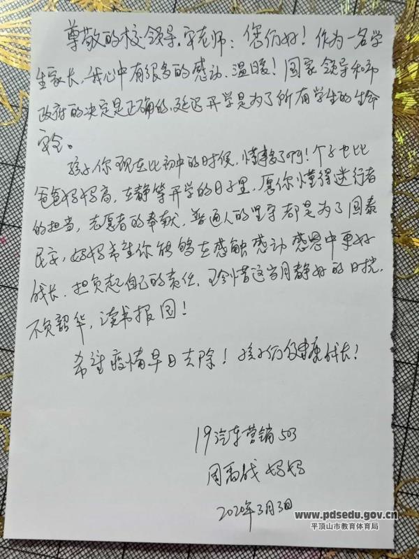 3月1日,平顶山市新冠肺炎疫情防控教育体育系统工作专班办公室发出了《静等开学的日子 愿你更好成长——致全市学生的一封信》。随后,市工业学校各班班主任在学生科的指导下,召开了主题班会。疫情期间的这次班会让学生和家长们深受鼓舞,纷纷在班级群、钉钉群发表感言: