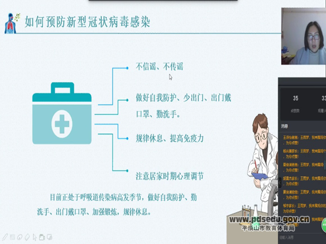 随着新冠肺炎疫情的蔓延,学生宅在家中已一个多月,幽闭的环境、单调的生活和学习的压力等,使一部分同学产生了焦躁的心理。为了帮同学们进一步掌握疫情防控知识,也为了缓解同学们的压力和焦虑,让大家更好地宅其身、习其业、修其行,自3月5至3月8日,平顶山市四中组织开展了新一轮疫情防控知识网络主题班会。