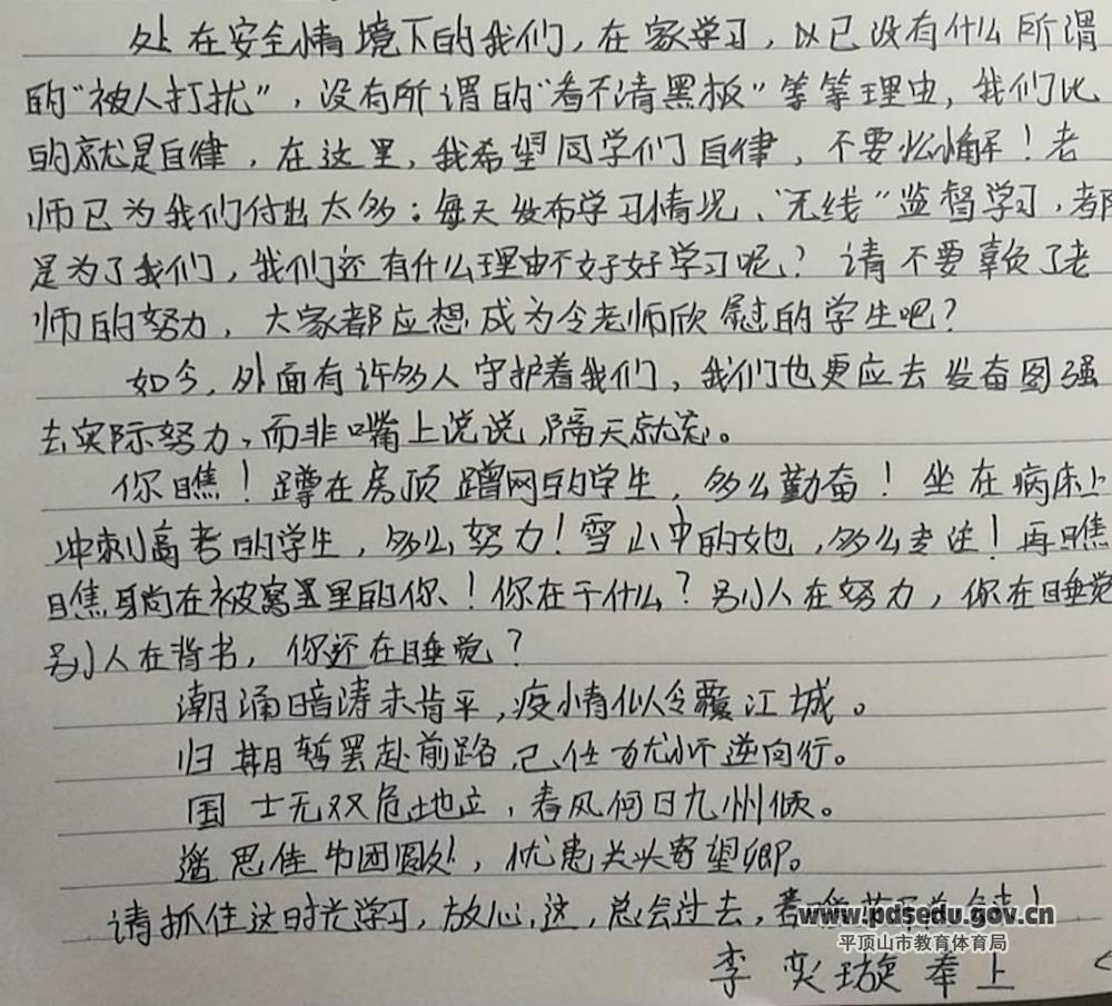 七(7)班李奕璇同学最先表达了她的心声:“你瞧,蹲在房顶蹭网的学生多么勤奋;坐在病床上冲刺高考的学生多么努力;雪中的她,多么专注;再瞧瞧被窝里的你……请抓住时光学习,疫情总会过去,春暖花开总会到来!”