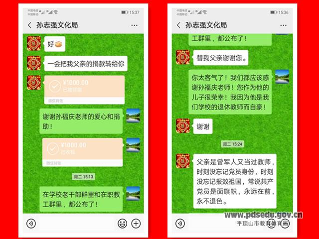 “我父亲曾是军人又当过教师,时刻没忘记党员身份,时刻没忘记报效祖国,常说共产党员是面旗帜,这次抗击疫情一定要献上自己的一份绵薄之力……”日前,平顶山外国语学校84岁高龄的退休老干部、老党员孙福庆委托其子向党组织交纳1000元捐款时这样说。
