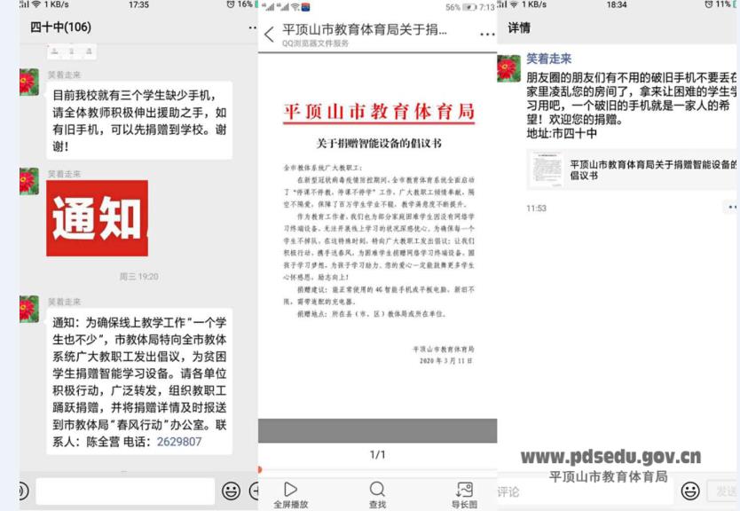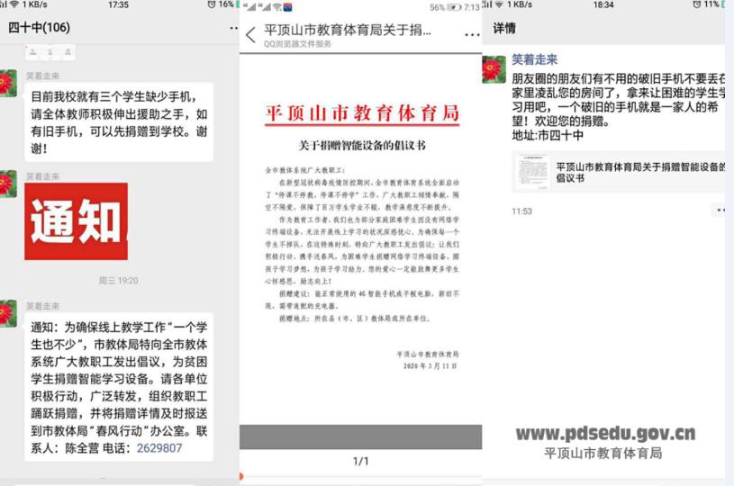 校长景艳伟了解这一情况后,立即向全体教师发出倡议:请全体教师积极伸出援助之手,将闲置的智能手机捐给困难学生,解决孩子们的听课问题,助力线上学习。活动一经发起,老师们纷纷响应,为困难学生的网络学习助一臂之力!曹雪娟老师专程到校向学生捐赠手机一部,助力解决困难学生线上听课难题。
