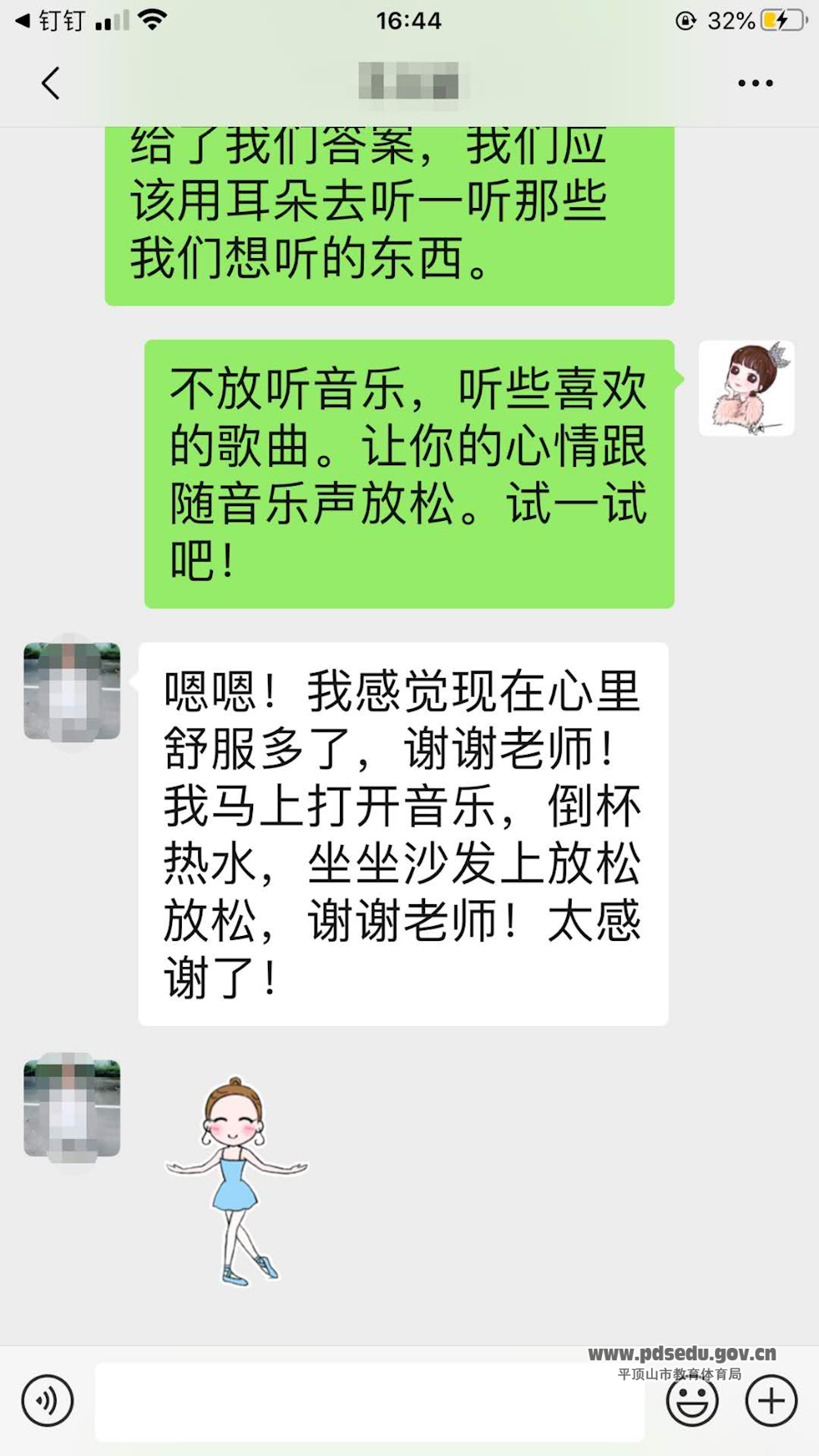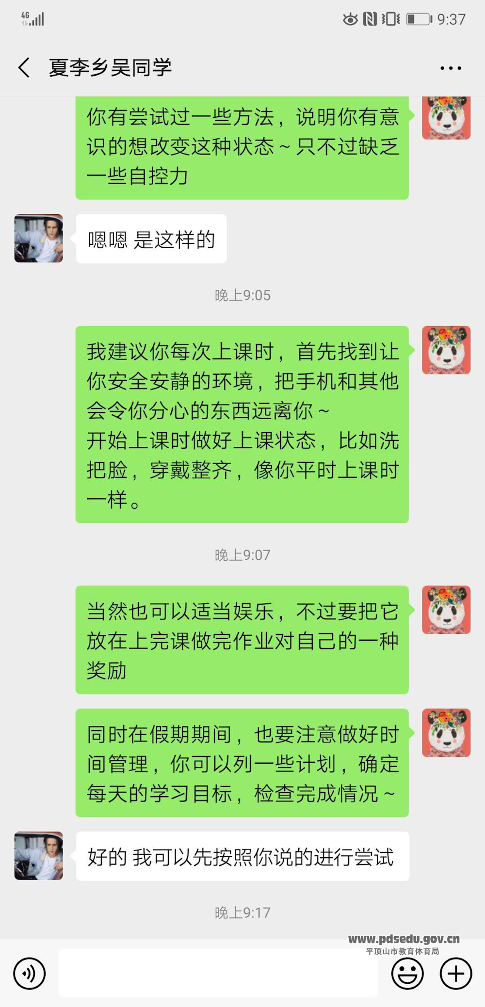 不久前,夏李乡中一名毕业班学生升学压力比较大,虽然学校开展的网上教学,但是他自己总是不得要领,所以产生了压抑和焦躁情绪。心理健康老师苏春梨在得知这一情况后马上通过微信对该生进行了心理干预,并指导他通过转移注意力、进行适当的体育锻炼等形式缓解压力。经过苏春梨的多次疏导,该生现在恢复了阳光和自信,又以饱满的精神投入到了网络学习中。