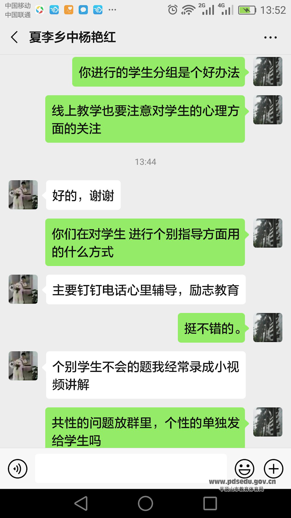 线上教学活动开展以来,除了对夏李乡中开展帮扶活动以外,还有许多老师与鲁山张官营一中的老师、学生取得联系。学校河南省优质课一等奖、全国物理教学展示活动大奖获得者邵霞老师就多次与张官营一中的物理老师孙艳英进行线上教研。通过交流她们共同探讨了如何对学生进行指导,如何调动学生学习的积极性,怎样疏导学生心理等,她们互相汲取经验,极大的调动了学生们的学习积极性,既掌握了知识,也培养了能力,达成了非常好的效果。