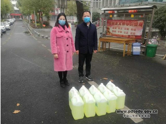 曹亚东带领总务处副主任刘立新,积极向市教体局汇报,教体局配送两个喷雾器,84消毒液、次氯酸钠消毒液150公斤。先后与宁波市星耀智能科技有限公司、苏康医疗器械公司等医疗机构联系,购买了六套防护衣、三部移动式紫外线消毒灯、20升免洗洗手液、20瓶普通洗手液、三个护目镜、两个喷雾器、120只医用口罩,500个一次性防护帽、15个医用废物桶、11个手持式红外额温仪、8支玻璃体温计。另外,接收社会人士捐赠医用口罩1000只,84消毒液200斤。这些物资,基本满足高三年级和九年级学生上课的需要。