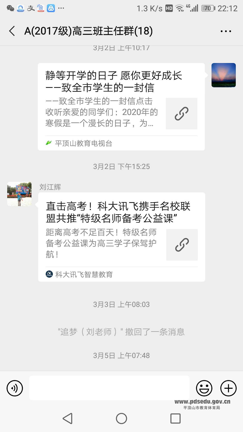 充分发挥班主任在家校联系中的纽带作用,形成以学生为中心,由班主任、任课教师、家长、同学、手机/平板/电脑、网上资源为一体的班级管理网络。班主任利用钉钉、微信等社交平台建立班级群,把家长、任课教师、全班同学、甚至主管校长和年级主任都拉进群里,以班主任为主,经常与家长沟通,使他们以身示范,身体力行,使学生在家养成和学校一样有规律的饮食习惯和作息时间,早上按时起床,晚上不熬夜,勤锻炼身体,按课表上课等。要达成共识,让学生明白,高考对每个人都是公平的。面对疫情,不仅是对学生学习能力的检验,还是对学生自我管理能力的检验。作为班主任和任课教师,一定要加强学生管理,抓得紧,做得细,要求到位;要多想办法,多辛苦一些,不怕麻烦,教学效果就一定能够保证。