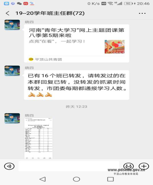 此倡议一经在二中班主任微信群里发出,立刻引起连锁反应,全体班主任在班级微信群里转发后,得到同学们的积极响应,各班团员踊跃参加学习。