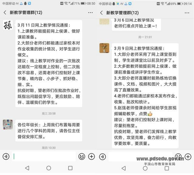 在线上教学的日子里,八中成立了校长林亚南任组长、副校长荆小辉任副组长、教务主任、教科室主任、各年级长为成员的线上教学巡查小组,林亚南、荆小辉每天坚持线上巡查,及时发现问题,及时反馈、及时解决。
