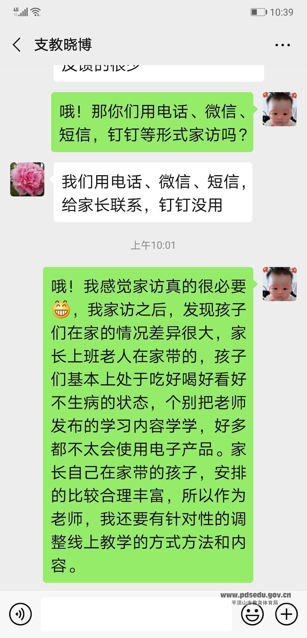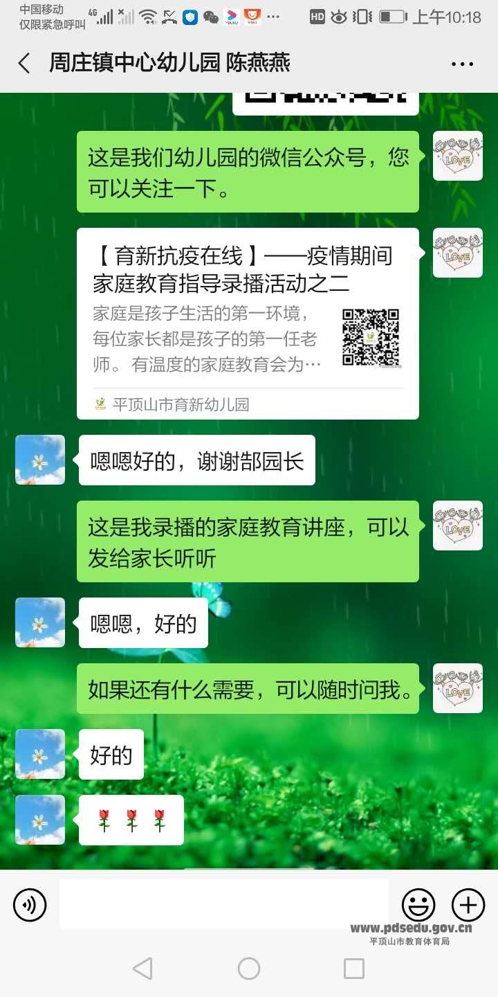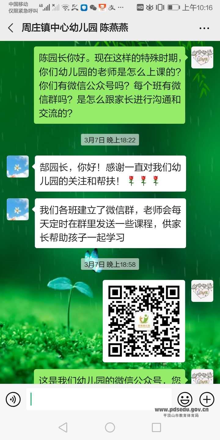 为了让受援幼儿园的老师们能更好地开展今后的工作,郜智睿、齐凯、张琼、郑玲等几位老师通过电话、微信的方式与宝丰县周庄镇中心幼儿园的教师进行交流沟通,询问该园教师在疫情防控期间怎样跟家长交流,怎样开展线上活动,提出自己的意见和建议。并通过推送优质课程资源、介绍家庭亲子游戏、线上研讨等,实现资源共享。双方教师通过互联互通,取长补短,将好的方法和建议运用到接下来的工作中。