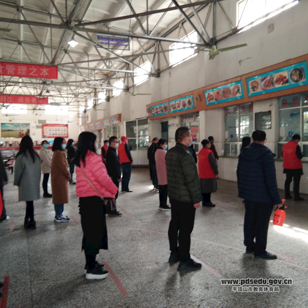 采用分批分流就餐制度,将食堂就餐区域划为五块,九年级十个班分两批次就餐。从一班开始打饭,每个班间隔5分钟,利用对讲机进行统一调度,各班级按照规定进出路线(大餐厅北门进,西门出)进入餐厅就餐。