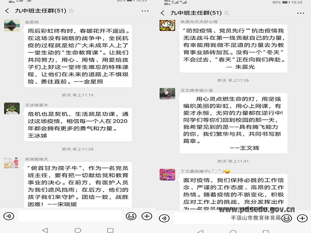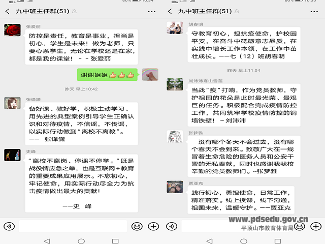 广大党员教师在这次疫情中起到了关键的模范带头作用,特别是全校34个教学班中有20名党员班主任和一名入党积极分子,还有很多积极向党组织靠拢的青年教师。他们勇于担当,不怕困难!他们没有豪言壮语,只有实际行动!既是九年级年级主任又是九(6)班班主任的张爱丽老师道出了一个老教师的心声:“防控是责任,教育是事业,担当是初心,学生是未来!做为老师,只要心系学生,无论在学校还是在家,都是我的课堂!”校长助理兼七(12)班班主任胡春明老师作为中青年优秀教师的代表展现了深深的教育情怀:“守教育初心,担抗疫使命,护校园平安,在奋斗中砥砺意志品质,在实践中增长工作本领,在工作中茁壮成长!”青年教师郭丹阳老师虽然不是共产党员,但作为政教员兼七(1)班班主任,同时又是体育老师的她在这次疫情中积极想办法,为全校学生录制运动健康小视频,充分体现了青年教师的热情与活力,并表示要用一个党员的标准要求自己,继续积极向党组织靠拢,争取早日加入中国共产党!